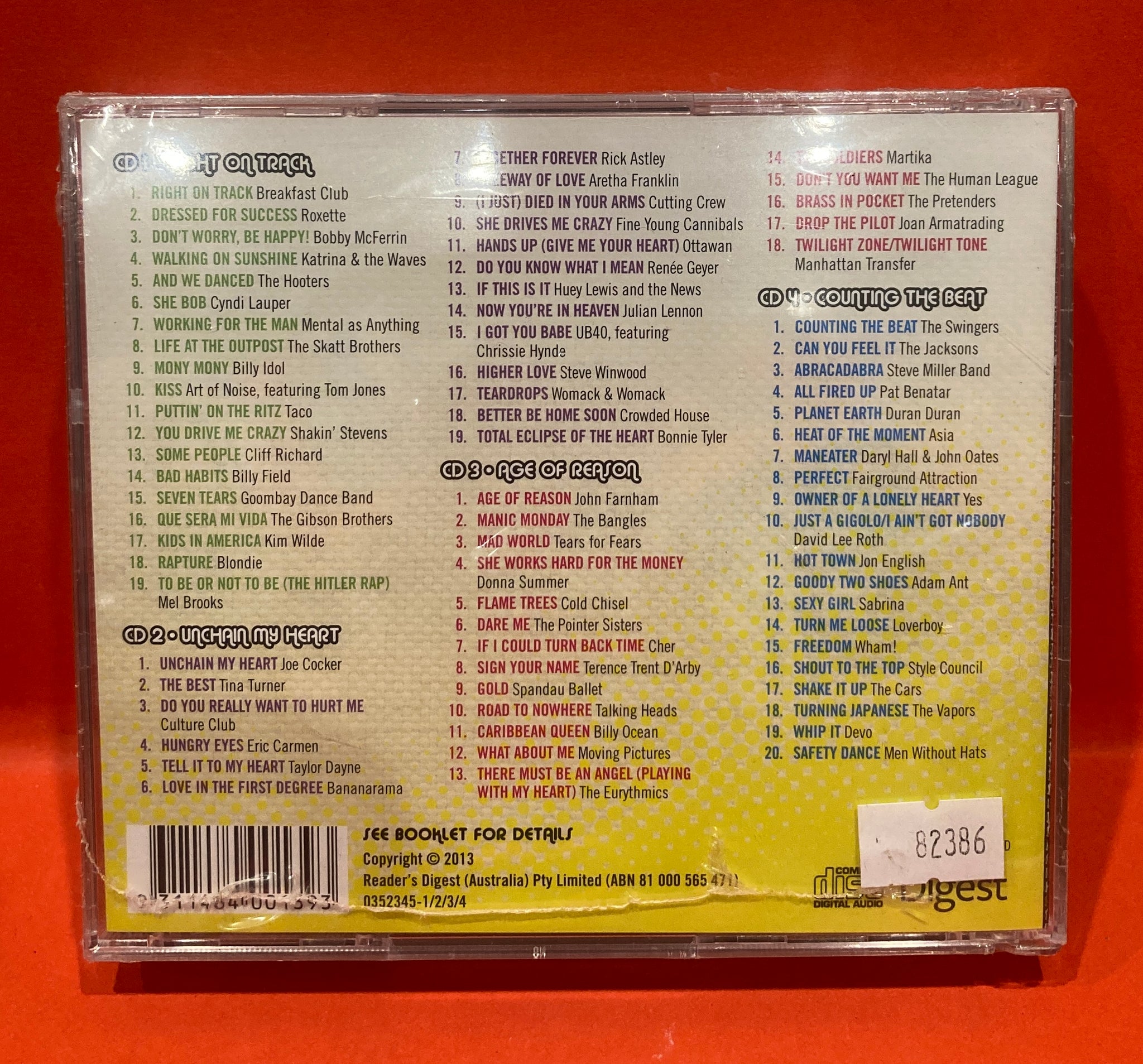 Rare New & Sealed 2013 Readers Digest Australia 4CD Boxed Set, features 76 Unforgettable Hits of the 80’s - a classic wide range of artists varying from a handful of one hit wonders to well established superstars – features Cold Chisel, Mental As Anything, Kim Wilde, Wham, Tears For Fears, Style Council, Talking Heads, Devo, Jon English, Fine Young Cannibals, Blondie, The Vapours, The Pretenders, Donna Summer, Spandau Ballet and lots more!